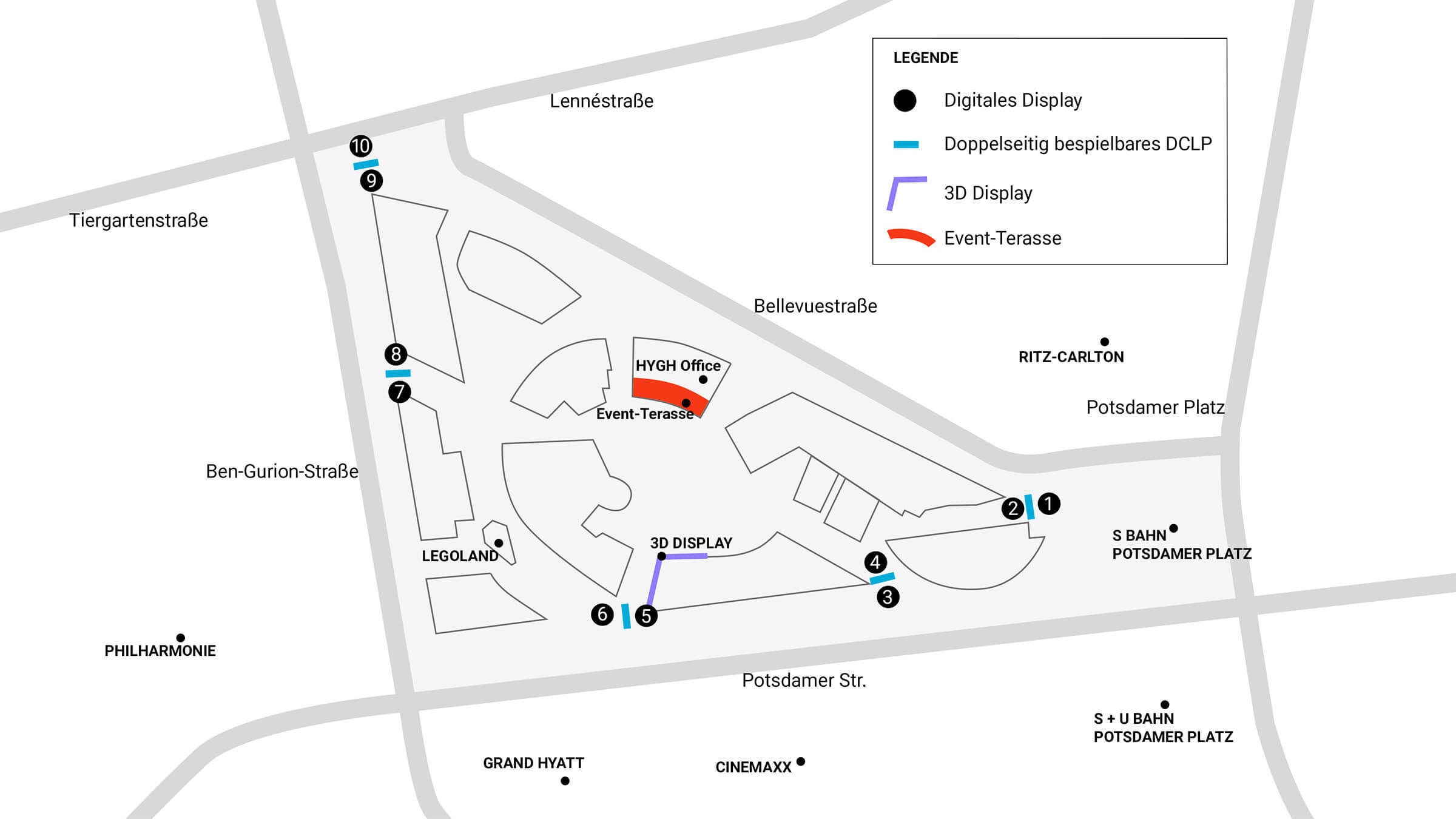 Das Center in Berlin wird um fünf digitale Stelen erweitert, ausgestattet mit hochauflösender 4K-Technologie und jeweils zwei 75-Zoll-Displays. Die Stelen sind strategisch in den Eingangsbereichen positioniert und dadurch optimal von der Straße aus sichtbar. Insgesamt entstehen zehn digitale 4K-Flächen, von denen jeweils fünf gleichzeitig für Werbung genutzt werden, während die andere Seite einen digitalen Wayfinder zeigt. Die Inhalte rotieren im Wechsel: So wird jede Displayseite abwechselnd zur Markenfläche oder zur Orientierungshilfe. In Kombination mit dem großformatigen 3D-LED-Display entsteht ein innovatives, ganzheitliches Markenerlebnis im Center.